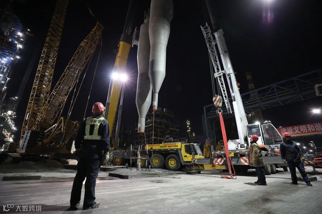 4月14日21时,工建公司安装二队连夜鏖战,完成蜡油催化装置再生器5组一二级旋风分离器吊装任务。安装二队从17时30分开始施工。每组旋风分离器重14.5吨,施工人员指挥450吨吊车主吊,25吨吊车溜尾,40吨拖车运输。设备吊装至胎架上后,将与再生器封头组对焊接,最终完成整体吊装。