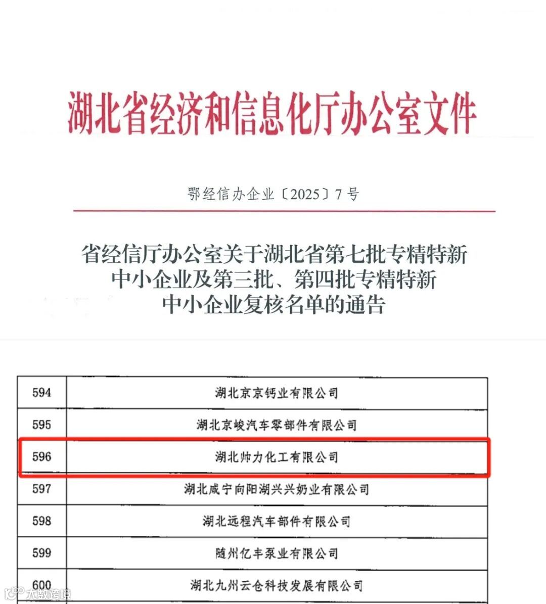 近日,湖北省经济和信息化厅发布第七批专精特新中小企业及第三、四批复核名单,湖北帅力凭借在民爆物品生产领域的专业化发展水平和持续创新能力,顺利通过湖北省级“专精特新”中小企业资格复审。这是湖北帅力连续两届获评此项省级认定,再次彰显了公司在该领域的技术领先地位。
