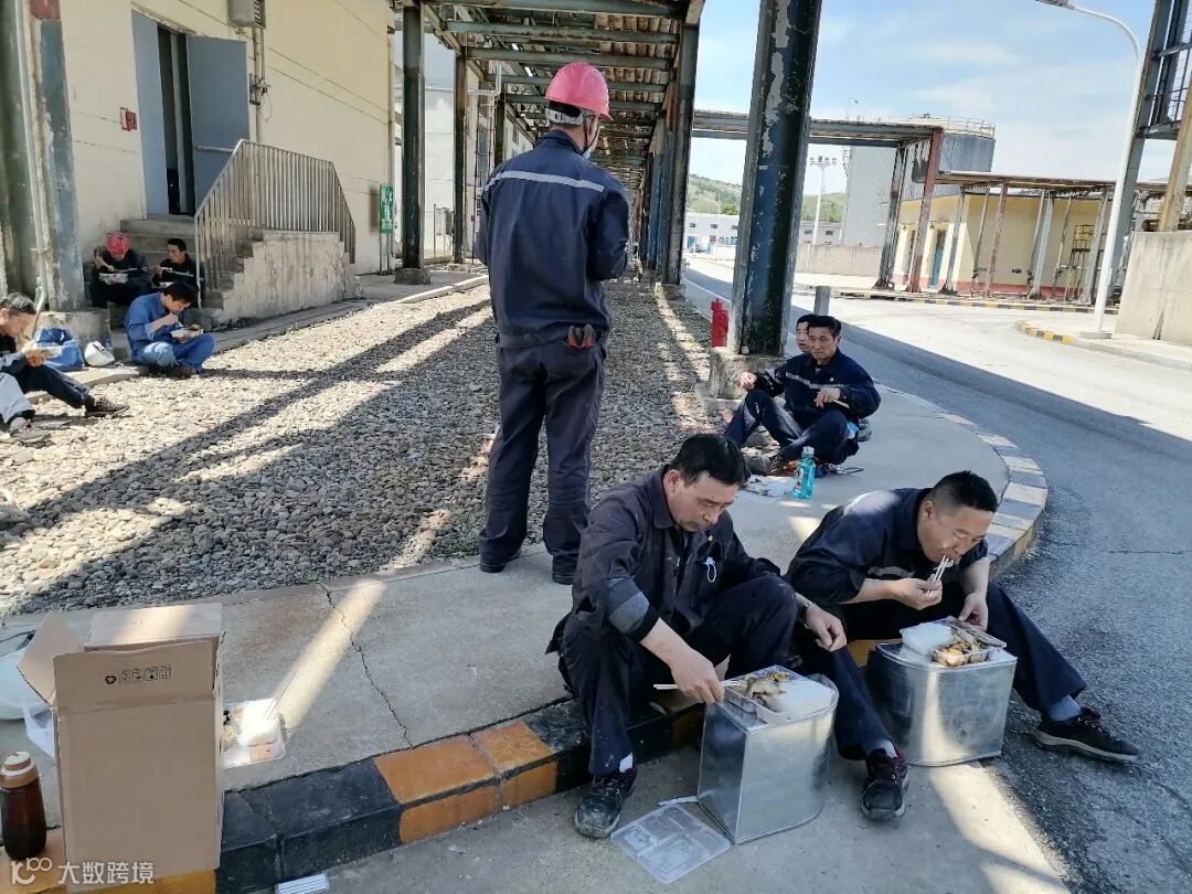 大家席地而坐,匆匆吃完盒饭,就马上投入到施工作业中。