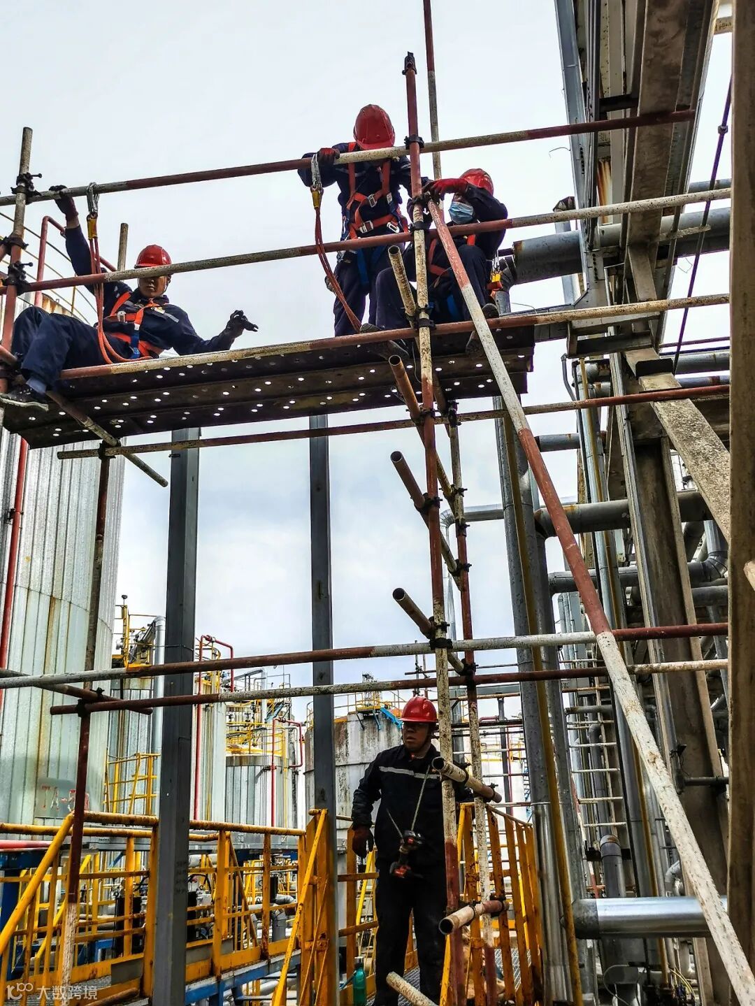 由于空间狭窄,杆子和跳板运送到上面后无法翻转,只能一点点往预定位置挪。虽然只有十几度的气温,大家已经是满头大汗。随着时间的推移,脚手架搭设的走台向着装置方向延伸。
