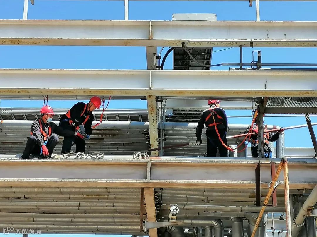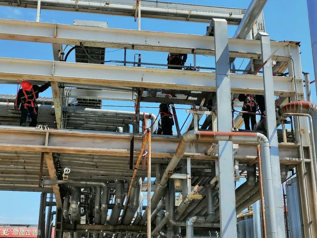 不到8点,全体人员达到施工现场,班长齐龙、孙君章、尹瑞亮等人系挂好安全带,带头爬上竖梯,开始搭设脚手架。高空的管线纵横交错,施工人员要在上面进行脚手架搭设非常困难。