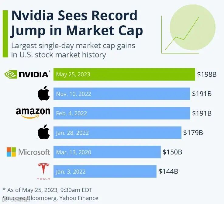 芯片股中,表现最好的英伟达早盘股价曾涨至394.8美元,涨幅超过29%,收涨24.4%,收盘价略低于380美元,创盘中和收盘历史新高,市值曾达到9550亿美元,距1万亿美元市值大关一步之遥,有望成为全球第九家市值突破1万亿美元的上市公司。盘中英伟达市值曾涨将近2000亿美元,几乎相当于两个英特尔的市值。英伟达创美股史上最大单日市值增长规模,一日的市值涨幅比标普500 472只成份股各自的市值都高。