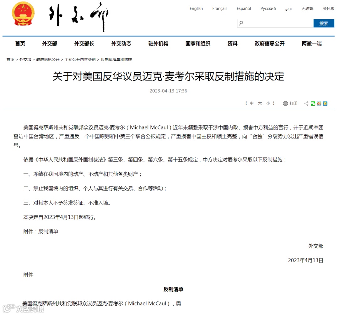 4月13日,外交部网站发布《关于对美国反华议员迈克·麦考尔采取反制措施的决定》。全文如下: