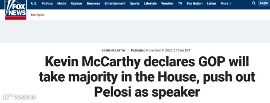 “凯文·麦卡锡宣布共和党将在众议院占据多数席位,把佩洛西赶下议长之位”,美国福克斯新闻于当地时间11月9日以此为题报道称,众议院少数党领袖麦卡锡8日宣布胜选,称共和党已获得了足够多的席位,可以夺回对众议院控制权。