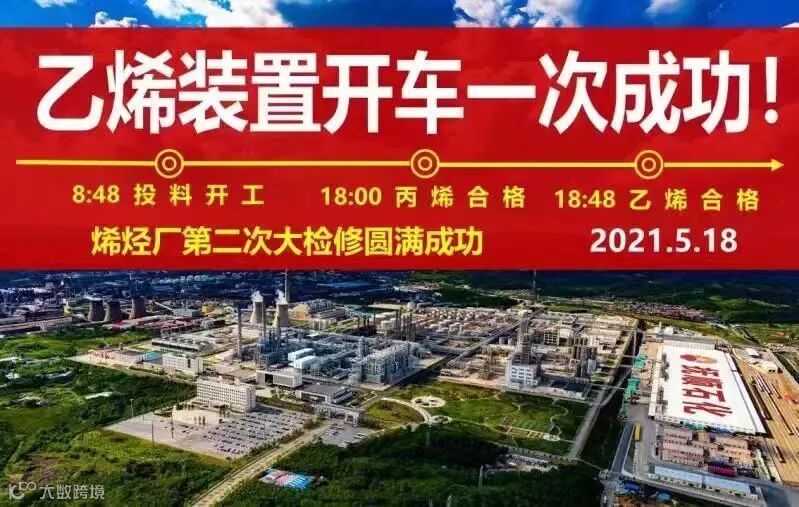 8时48分,7号裂解炉投油,历时10个小时,18时48分,碳二加氢反应器产出合格产品实现开车一次成功,烯烃厂第二次大检修圆满成功。
