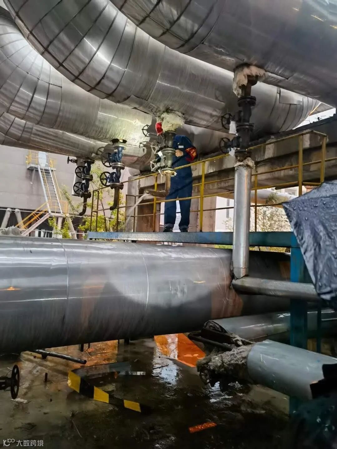 该厂汽机车间操作人员冒雨进行暖管操作