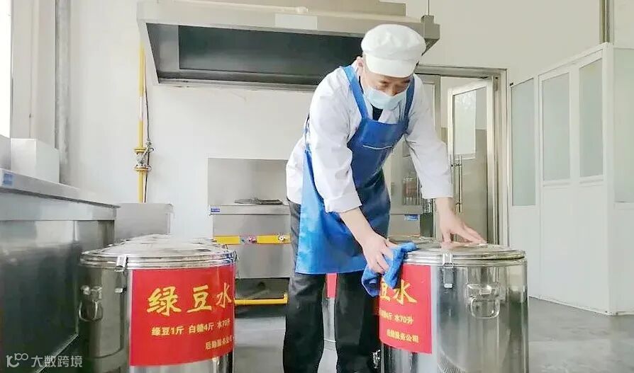 在乙烯食堂,厨师李春来师傅每天凌晨1点30分就起来点火烧水,按配比制作姜糖水、果汁、酸梅汤、糖茶水四种饮品,熬制一个多小时到汤水浓稠口感适宜,早晨8点钟四个品种34桶850公斤热饮才能装桶完毕,送往现场服务站和送水点。