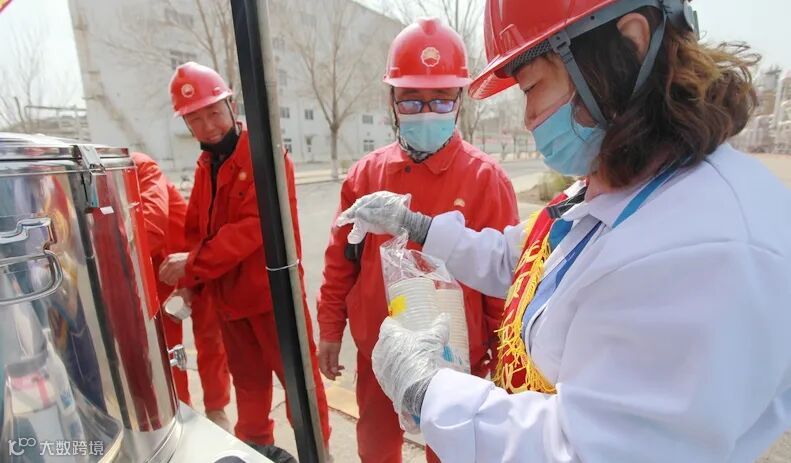 在烯烃厂食堂,今年57岁的后勤公司马全福忙得满头是汗,正把50斤一桶的姜糖茶抬上餐车。作为志愿者,他已经在烯烃食堂服务两周了,每天送水40多桶。