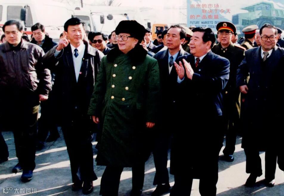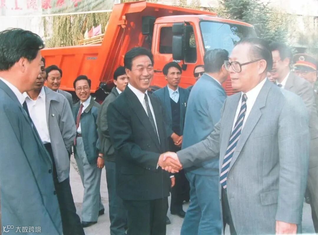 1990年9月25日,江泽民同志到兵器工业617厂视察,图为考察北奔重卡时的场景。