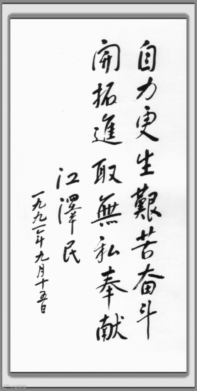 1991年9月15日,正值人民兵工创建60周年之际,江泽民同志为人民兵工题词:自力更生,艰苦奋斗,开拓进取,无私奉献。