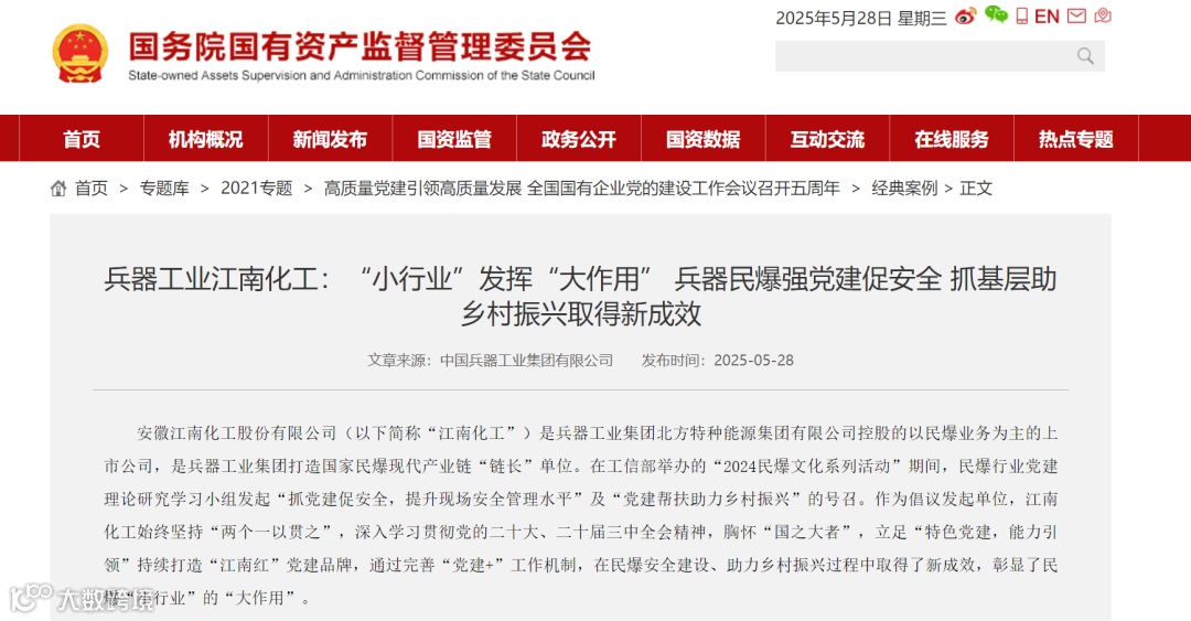 5月28日,国务院国资委官网以《兵器工业江南化工:“小行业”发挥“大作用” 兵器民爆强党建促安全 抓基层助乡村振兴取得新成效》为题刊发了江南化工高质量党建引领高质量发展的案例。现全文转载如下:
