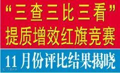 经过公司各处室考评和竞赛评审委员会审议,11月份公司“三查三比三看”提质增效红旗竞赛结果于日前揭晓。本次评比综合11月份各单位创效、得分情况,共有9家单位获得流动红旗。