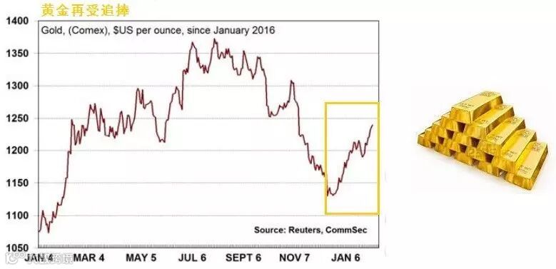 澳洲国民银行(NAB)在最新大宗商品展望报告中表示,特朗普政府的非传统经济政策,英国脱欧谈判的不确定性,以及欧洲民粹主义抬头,意味着全球地缘政治风险加重,今年作为避险资产的黄金可能面临更大需求。