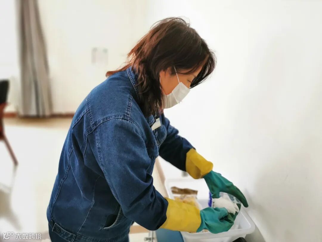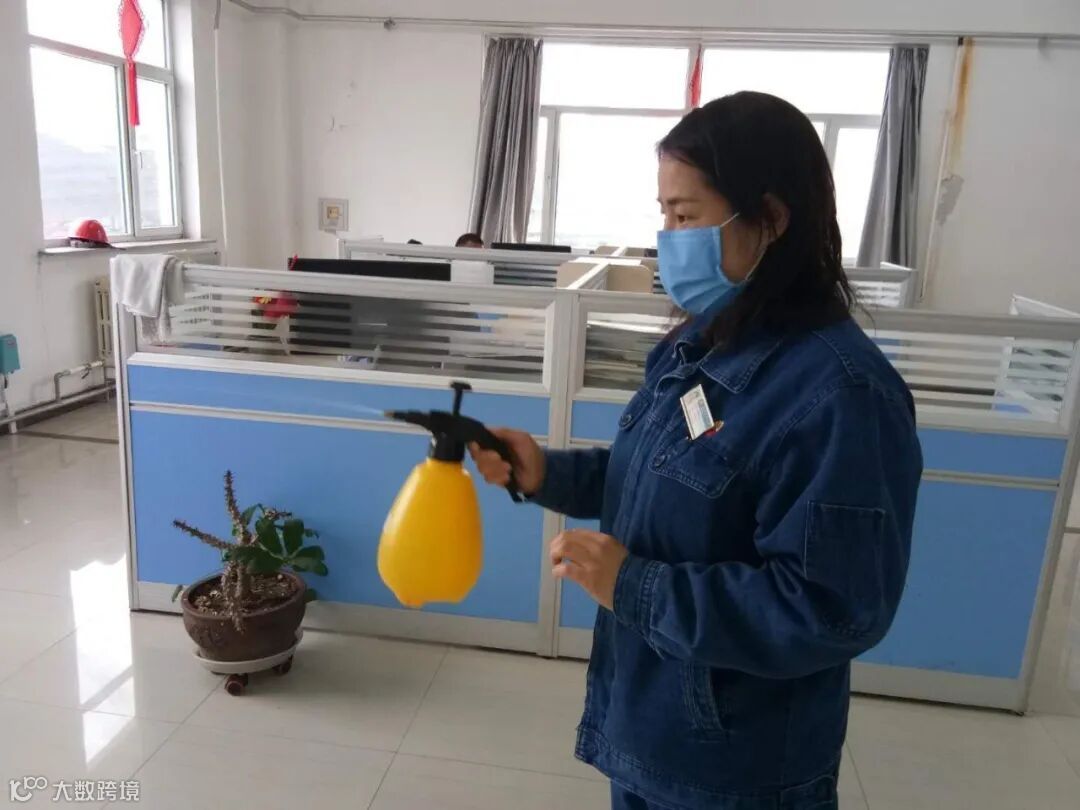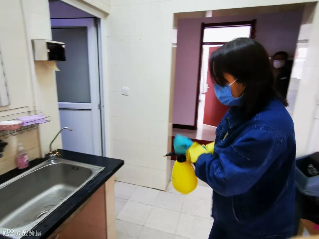 她对办公室消杀工作一丝不苟。对办公岛、会议室、走廊、卫生间等各处进行认真清理,不给病毒一丝存留空间。