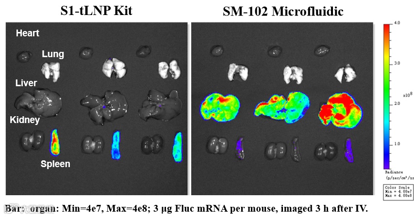 使用Mal-S1-tLNP 试剂盒包载Fluc mRNA,经小鼠静脉注射,脾脏靶向特性显著,制备合成LNP表面自带Mal基团,可适用于“表面偶联法”进行抗体偶联。