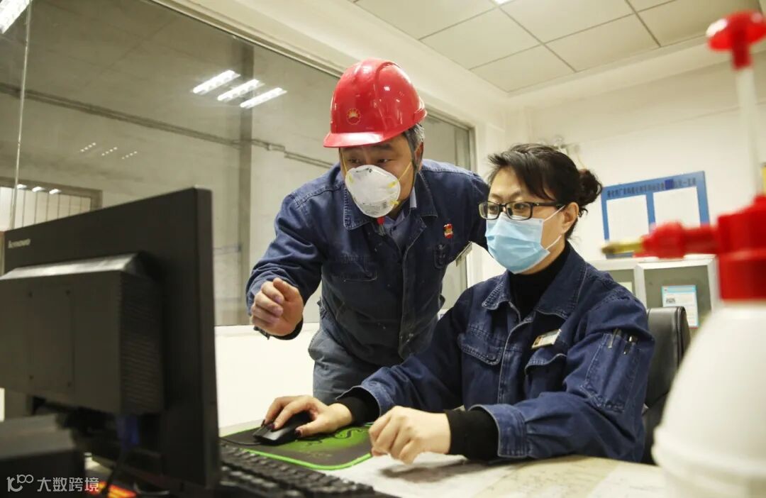 异构车间一班班长黄忠华(左)与PIC岗位操作员研究工艺流程方面的合理化建议