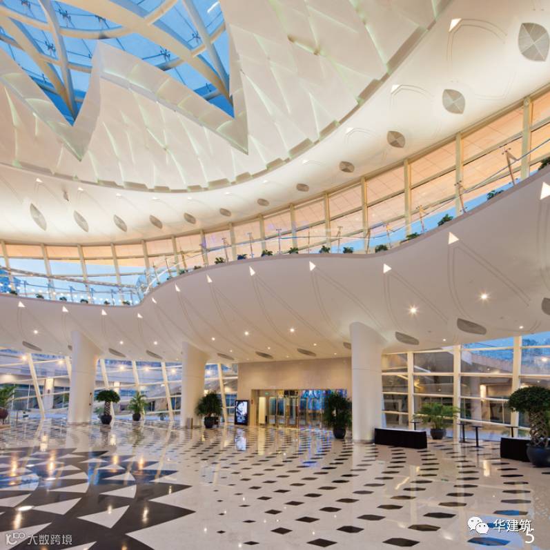 从地下-7.50m通至地上22.50m,支撑大屋顶的钢结构“立柱”,经过精心设计和多方努力,最终成功打造成为一棵生意盎然、郁郁葱葱的“生命之树”,抬头仰视,双曲面的“树叶”层层叠叠,与大厅装饰融为一体,恰似片片跳动的羽翼,再次显示着凤凰飞翔的灵动仙姿。“树”中心配以跌宕起伏的乐感喷泉及动态灯光,喷泉从地下-12m处喷涌而上,上覆艺术型的不锈钢灯光装置,结合室内地面黑白相间的羽翼状大理石拼花图案,在这里,声、光、影、形的共同配合,使“生命之树”散发出勃勃生机,也浑然成为一尊艺术品。