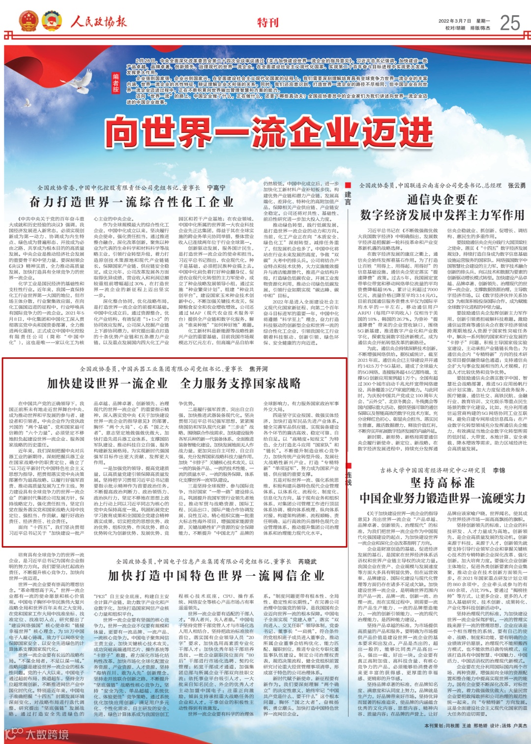 3月7日,由中国人民政治协商会议全国委员会主管主办的《人民政协报》刊发全国政协委员、社会和法制委员会副主任,中国兵器工业集团有限公司党组书记、董事长焦开河署名文章《加快建设世界一流企业 全力服务支撑国家战略》。