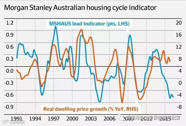 摩根士丹利澳洲房地产周期指数(蓝)和实际房价增速(红) (来源:摩根士丹利)