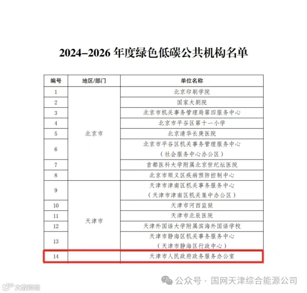 近日,国家机关事务管理局、国家发展和改革委员会发布绿色低碳公共机构名单,其中国网(天津)综合能源服务有限公司托管运维的政务中心能源托管项目—天津市人民政府政务服务办公室荣获2024-2026年度绿色低碳公共机构。