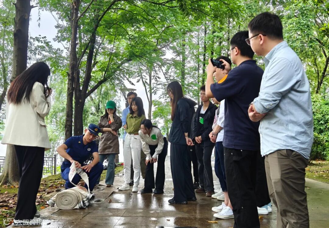 消防演习结束后,在武汉东湖新技术开发区消防救援大队的指导下,参与人员学习消防水带、干粉灭火器、一次性消防面具等消防工具的使用方法,并进行实操演练。