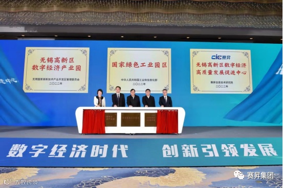 大会现场中心副主任何小龙、江苏省工信厅副厅长戚玉松、无锡高新区党工委书记崔荣国、无锡市工信局局长吴燕、无锡高新区党工委副书记章金伟共同为江苏赛昇无锡高新区数字经济高质量发展促进中心揭牌,并见证江苏赛昇与无锡高新区全面合作达成。
