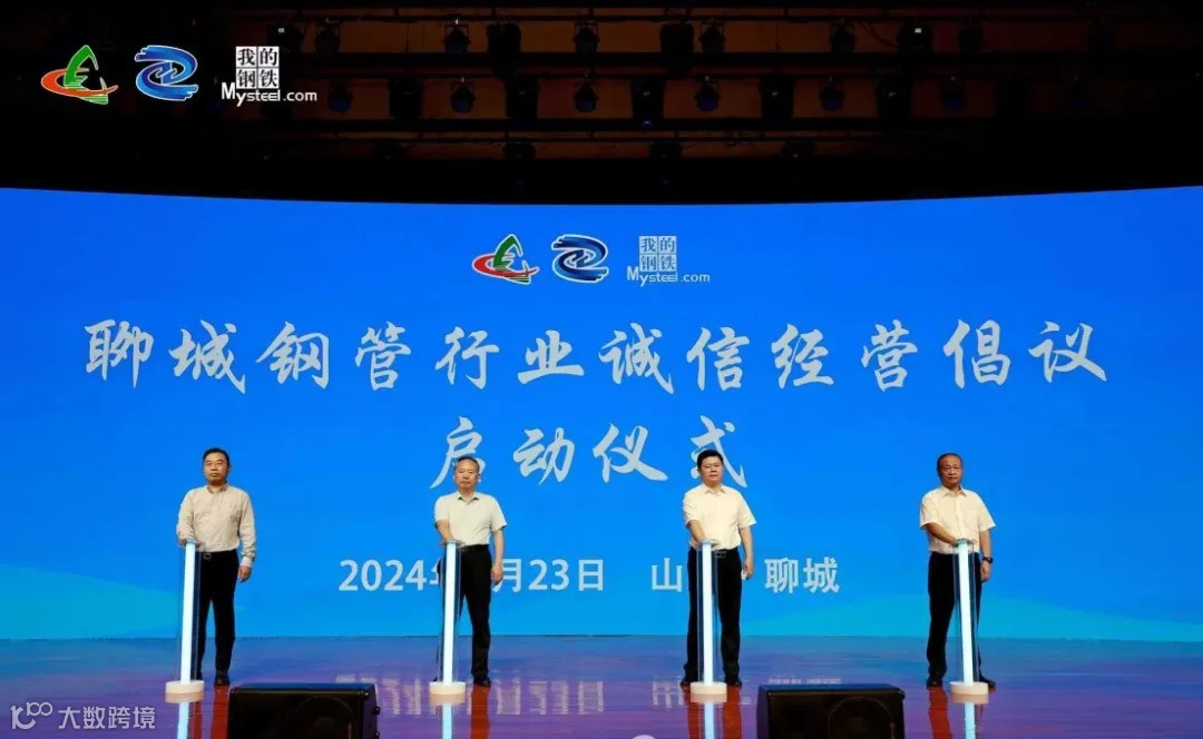 会议进行《聊城钢管行业诚信经营倡议》启动仪式,山东省聊城市人民政府党组成员、副市长 刘培国、聊城经济技术开发区党工委书记、管委会主任贾鹏柱、聊城市钢管经营者协会会长、山东中冶石油机械有限公司董事长 孙克强、上海钢联 联席董事长、总裁 高波,共同启动《聊城钢管行业诚信经营倡议》,共同助力聊城无缝管行业高质量发展,推动无缝管行业的诚信经营,促进整个行业的健康可持续发展。