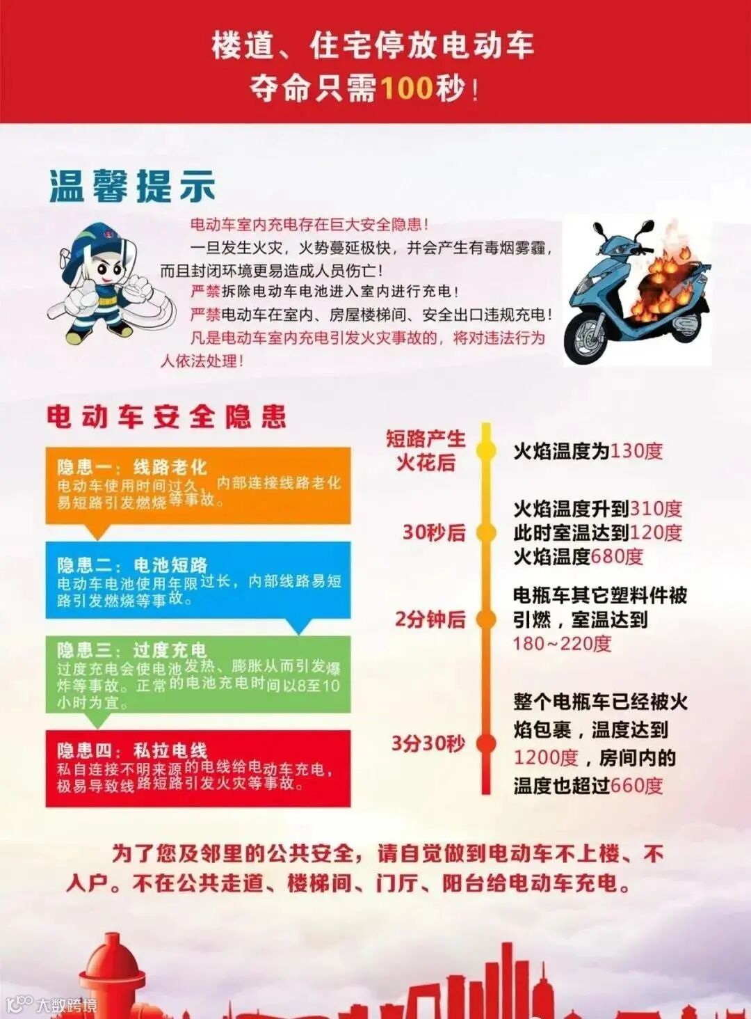 2、根据统计表明:60%的电动车火灾发生在20时至次日5时之间;电动车火灾致人员伤亡的,90%是因为电动车停放在门厅、过道等部位。
