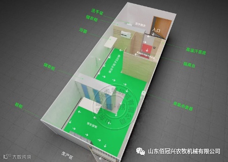 专门设立更衣室来清洗以及放置衣服和鞋子,进出更衣室也要设置消毒池。衣服要在脏区、淋浴区以及净区做好划分,外面的衣服留在脏区,净区放置猪场专用服装,根据猪场布局不同分区穿不同颜色工作服,外来人员和维修人员也要着装不同颜色衣服。