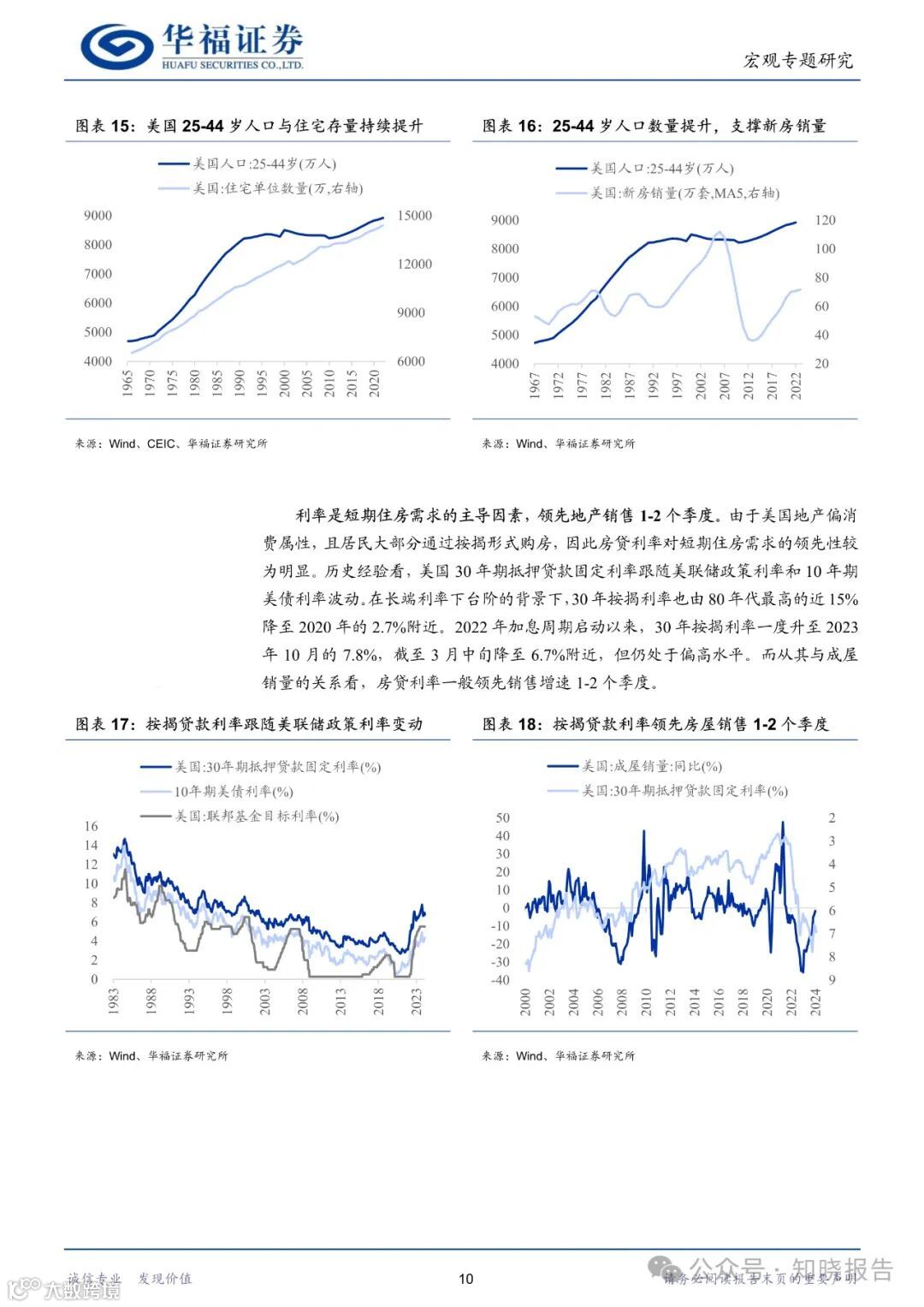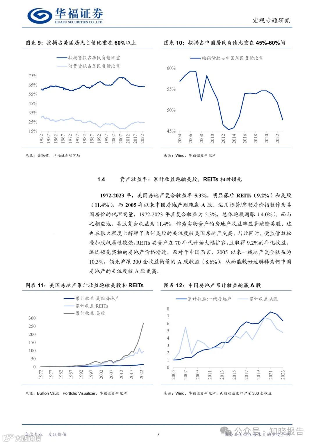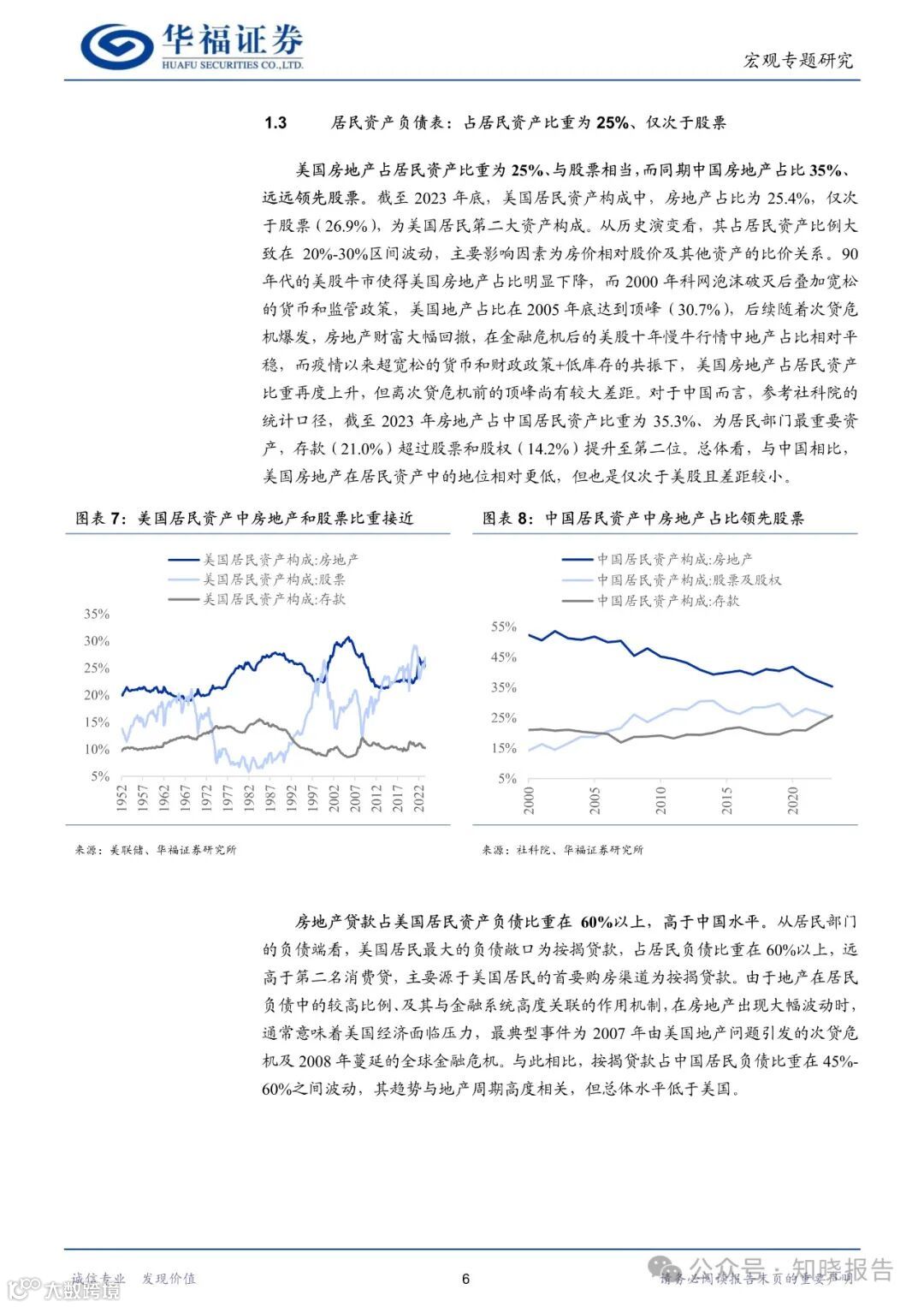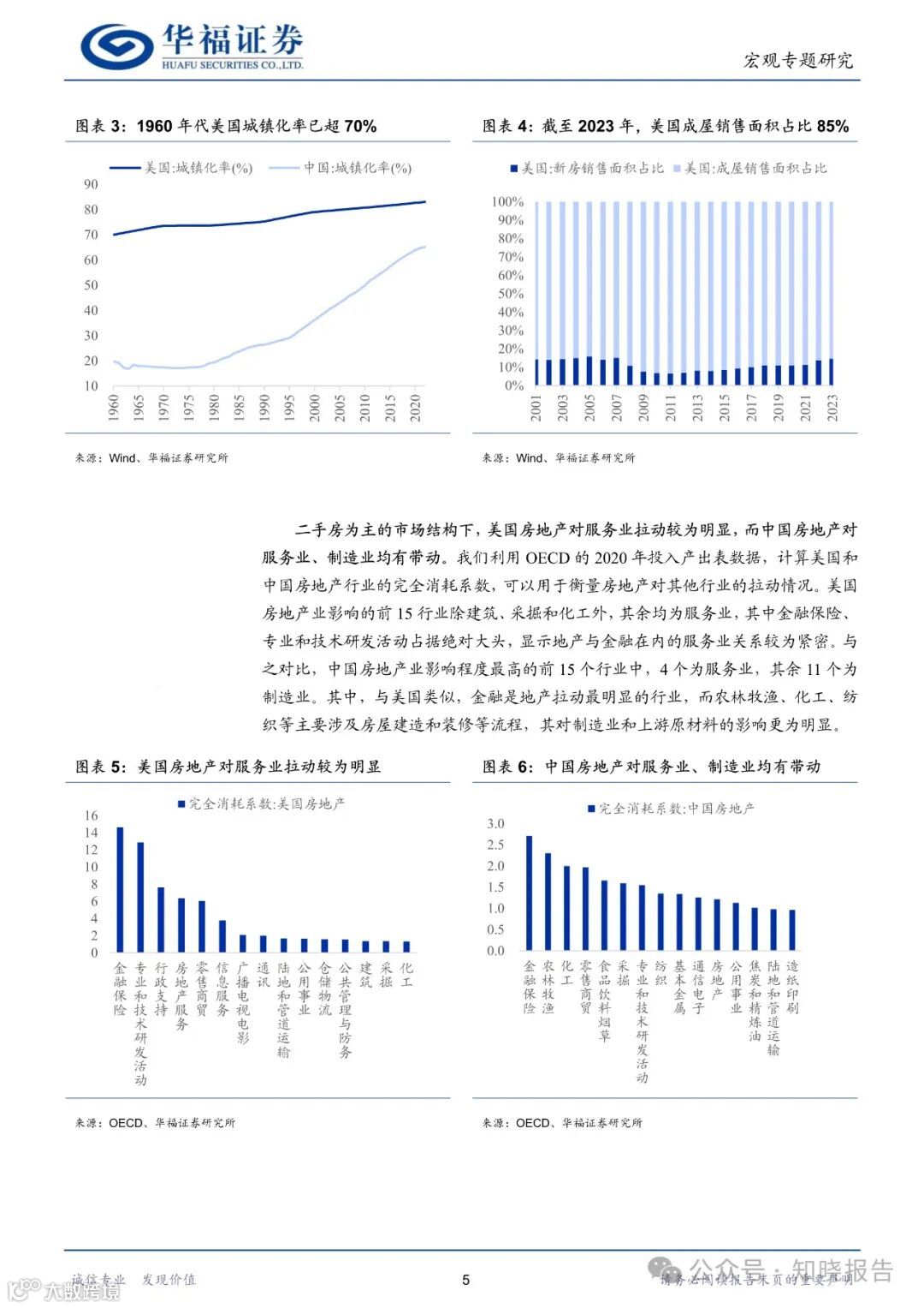 (2)市场结构与产业关联:超高城镇化率下,美国地产销售中二手房占比超80%,而中国不到四成。二手房为主的市场结构下,美国房地产对服务业拉动较为明显,而中国房地产对服务业、制造业均有带动;(3)居民资产负债表地位:美国房地产占居民资产比重为25%、与股票相当,而同期中国房地产占比35%、远远领先股票。