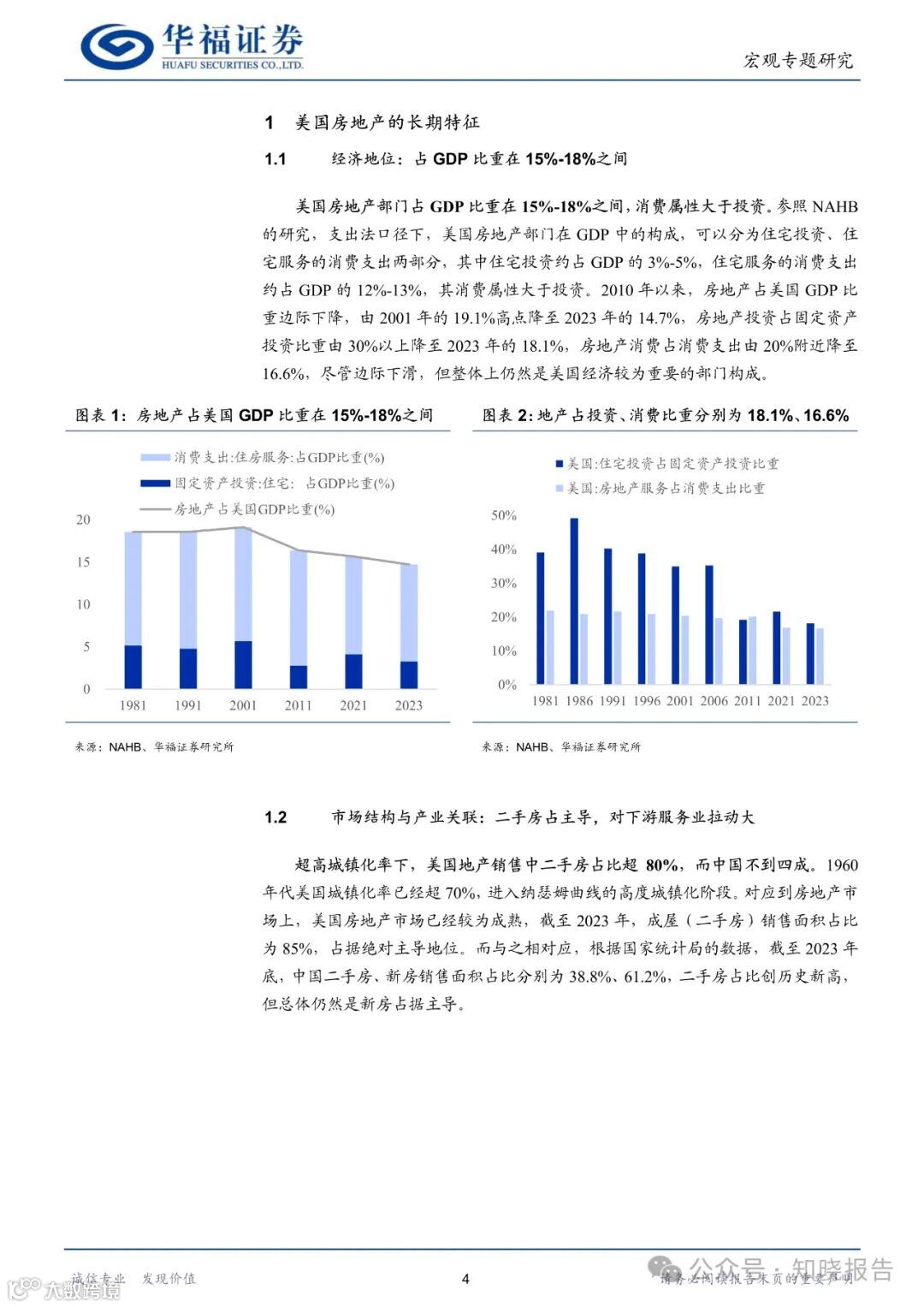 美国房地产是美国经济重要组成部分,二手房为主导的市场结构下,其消费属性较强,占居民资产比重与股票相当:(1) 经济地位:房地产部门占GDP比重在15%-18%之间,住宅投资、住宅服务的消费支出分别占GDP的3%-5%、12%-13%,消费属性大于投资;