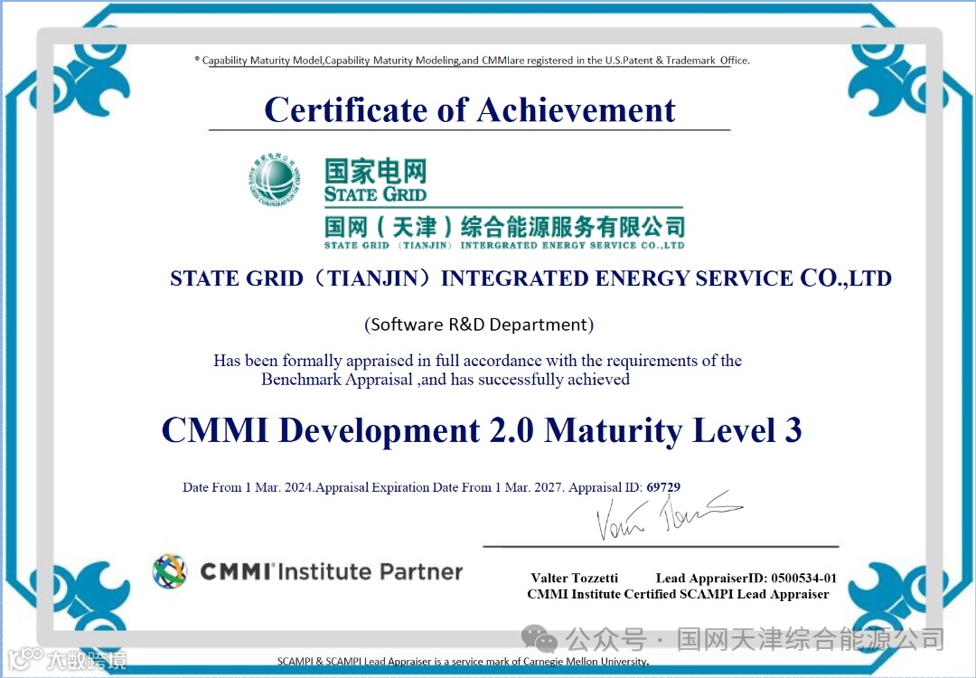2024年3月12日,国网(天津)综合能源服务有限公司顺利取得CMMI3级软件能力成熟度模型集成资质认证,标志着该公司在软件研发、项目管理、过程组织等方面已迈入较高水平阶段。