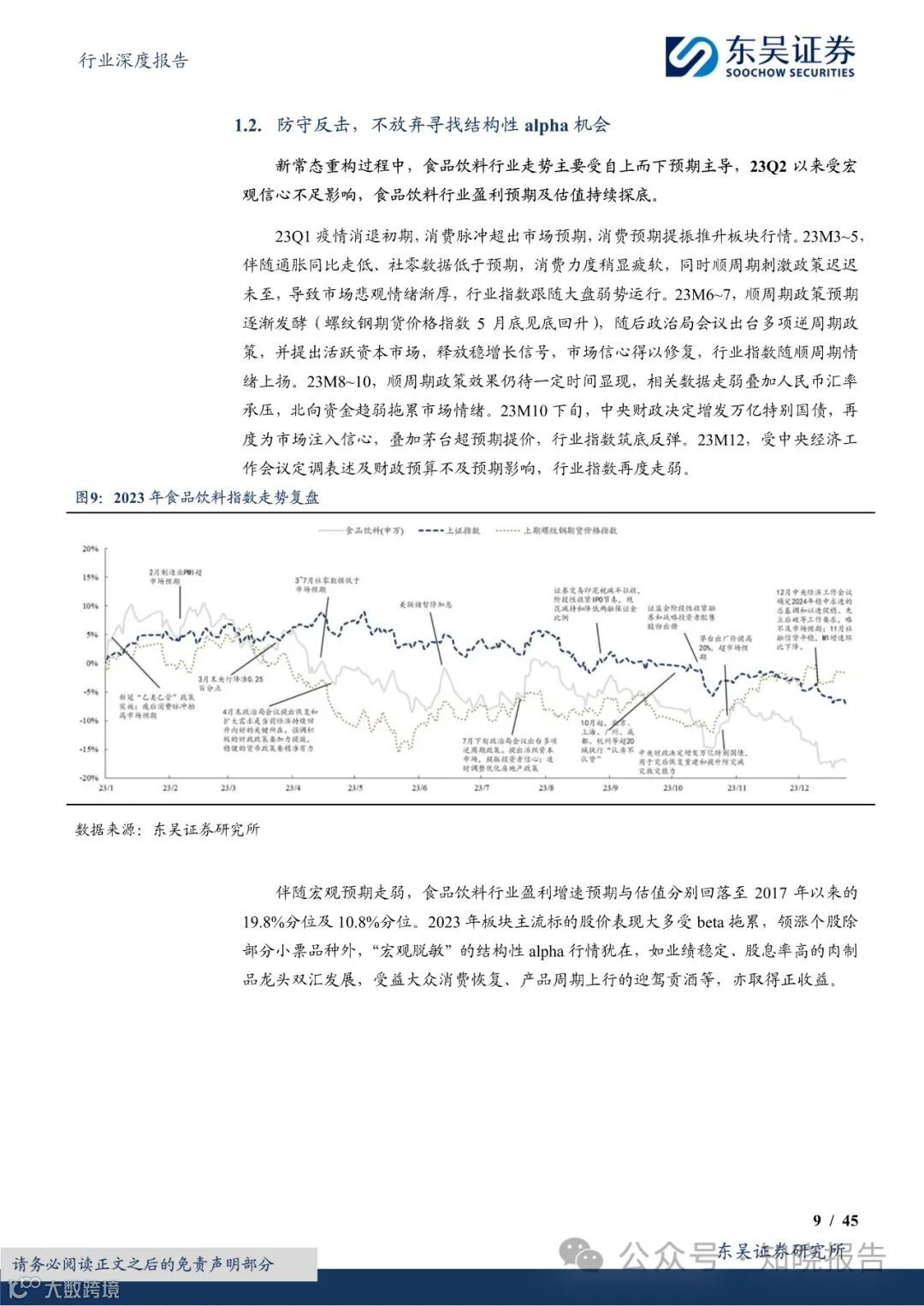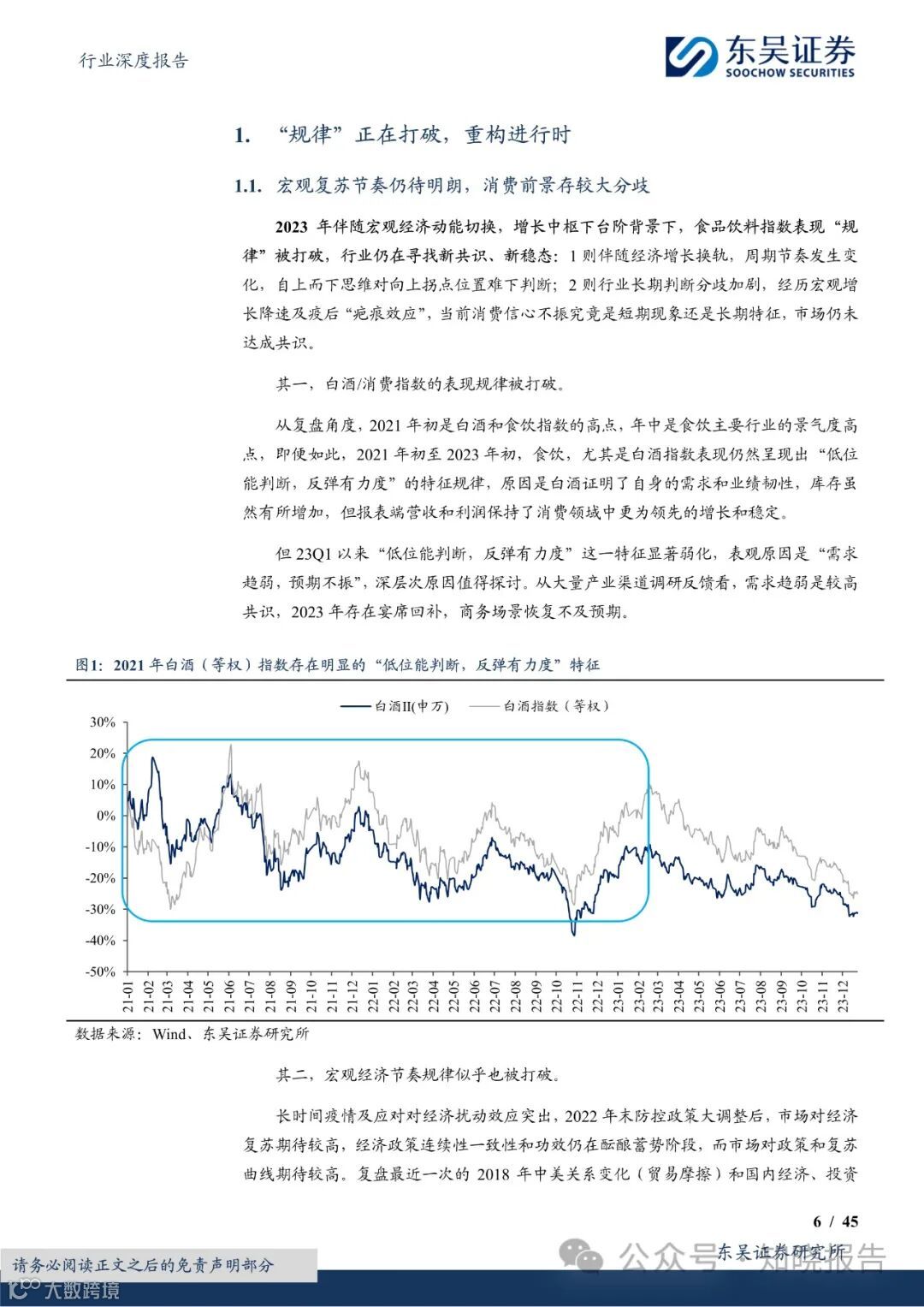 惯性“规律”打破,新常态重构进程中。其一,白酒/消费指数的表现规律被打破。虽然拐点在 2021,但 2021 年初至 2023 年初,食饮,尤其是白酒指数表现仍然呈现出“低位能判断,反弹有力度”的特征规律。