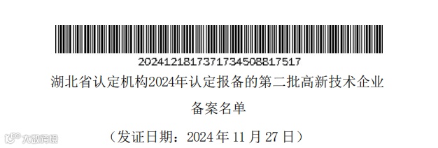 2024年12月18日,全国高新技术企业认定管理工作领导小组办公室正式发布了《对湖北省认定机构2024年认定报备的第二批高新技术企业进行备案的公告》。
