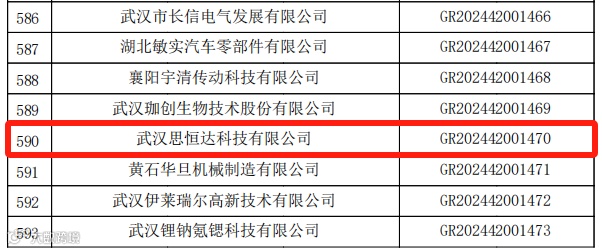 光谷微创新实验室入孵企业武汉思恒达科技有限公司成功入选湖北省认定机构2024年认定报备的第二批高新技术企业: