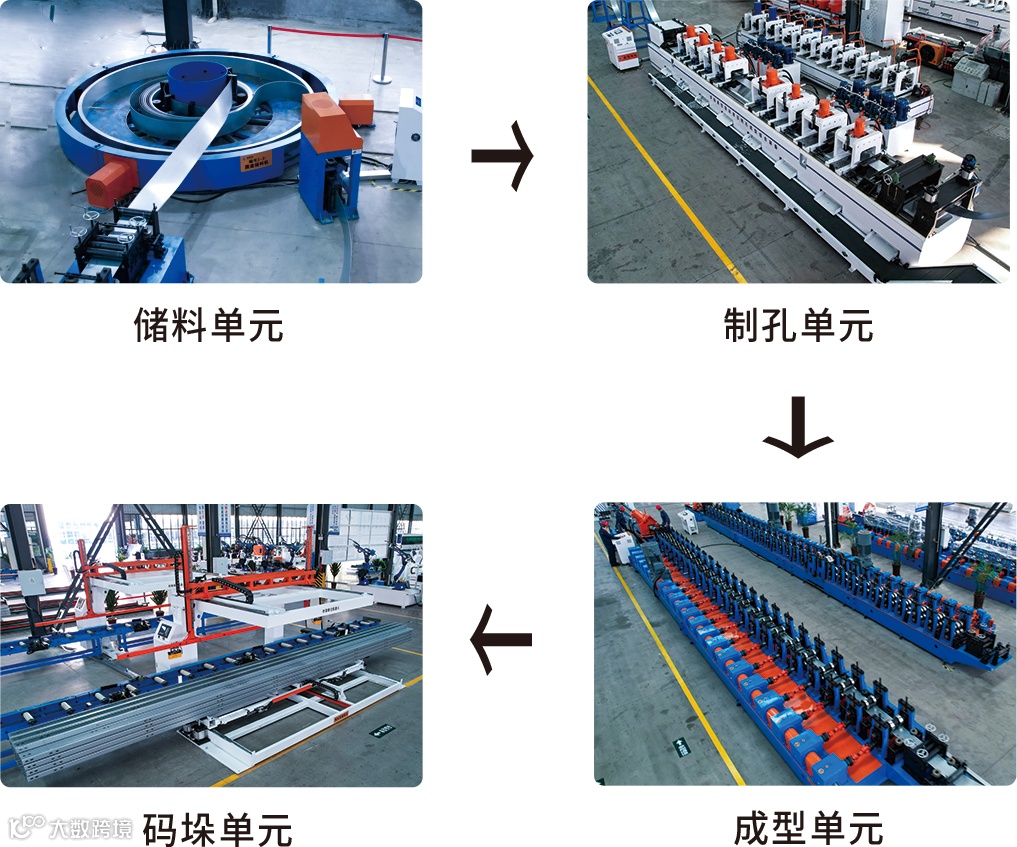这是一款与山东大学联合研制的专利产品。主要用于C型钢的冲孔成型,整条生产线仅用一人。每分钟稳产30米,冲孔精度±0.5毫米,长度公差±1毫米,无累计误差。