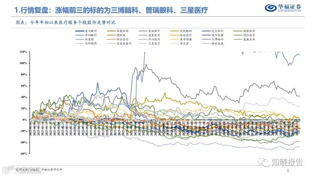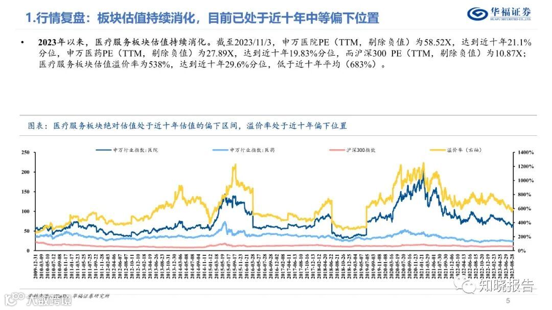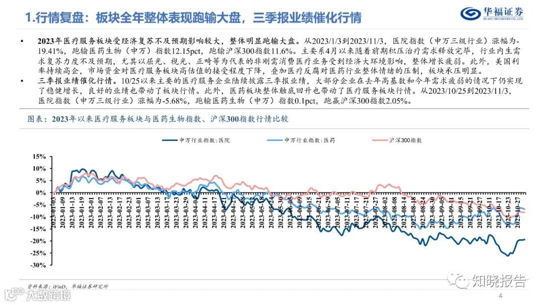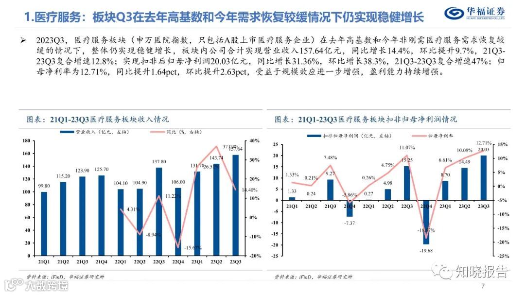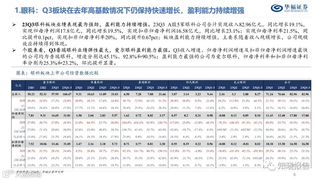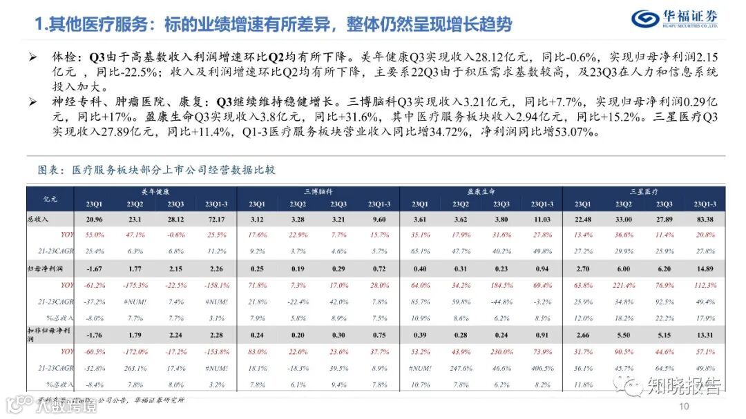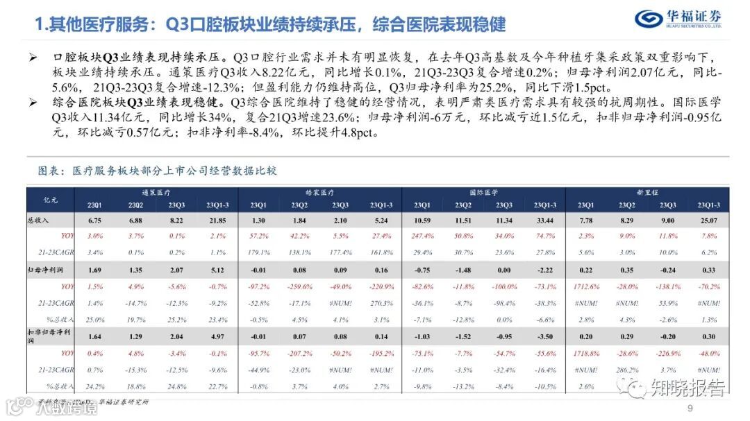 分板块来看,(1)眼科Q3仍保持快速增长。A股5家眼科公司23Q3合计实现收入82.96亿元(同比+19.1%),归母净利润17.8亿元(同比+19.5%),扣非归母净利润16.58亿元(同比+23.1%) ;(2)口腔Q3绩表现持续承压;(3)综合医院Q3维持稳健趋势;(4)其他医疗服务标的增速有所差异,整体仍维持增长态势。