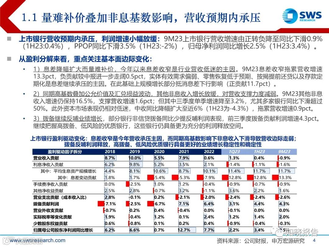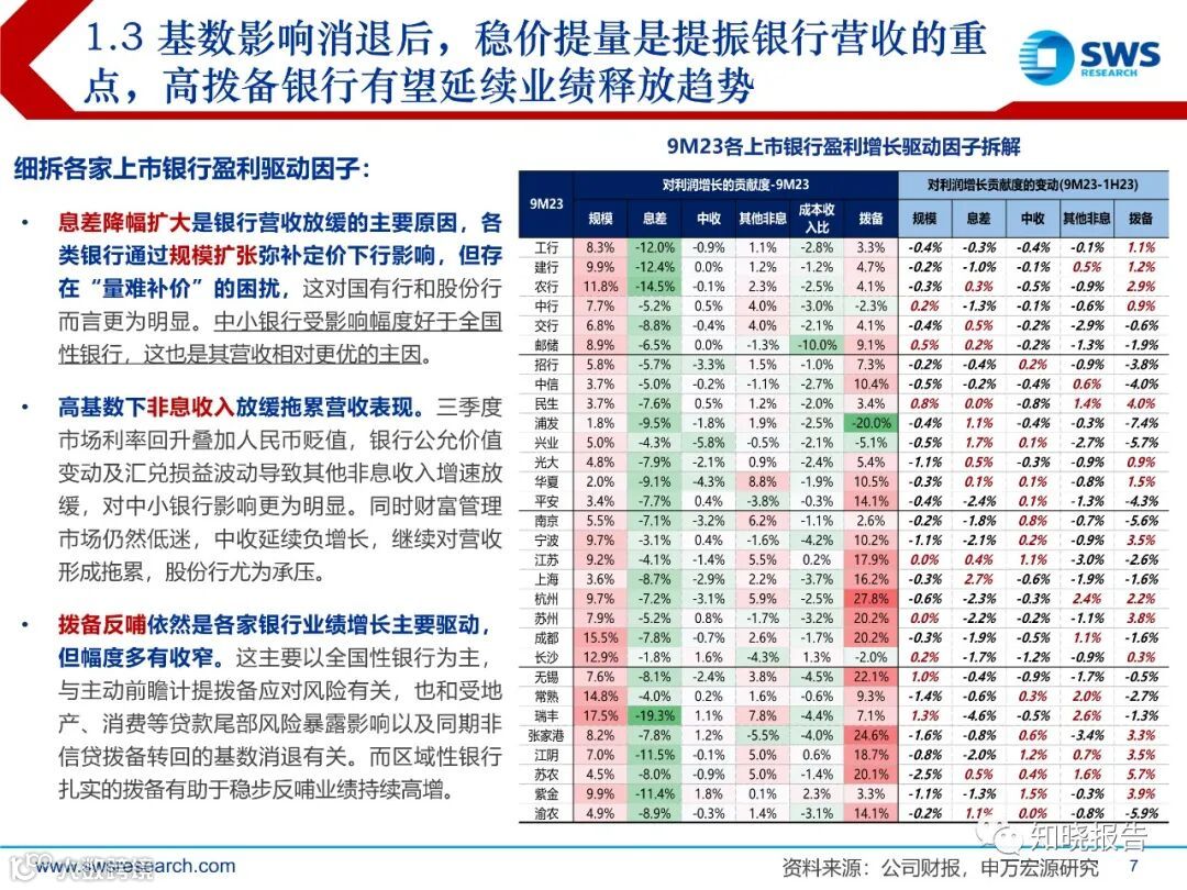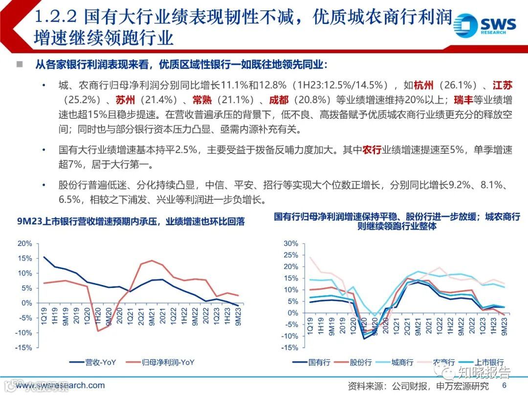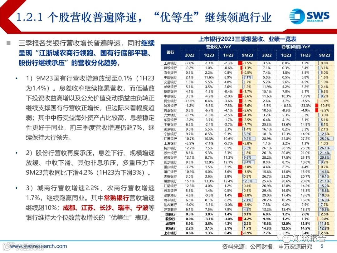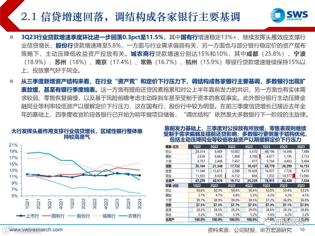 3Q23行业贷款增速环比回落0.3pct至11.5%,其中国有行贷款增速超13%,继续发挥头雁效应;股份行进一步降速至5.8%为各类银行最弱;城农商行整体维持更好景气表现,成都、宁波、苏州、南京、常熟、杭州等贷款增速维持超15%。