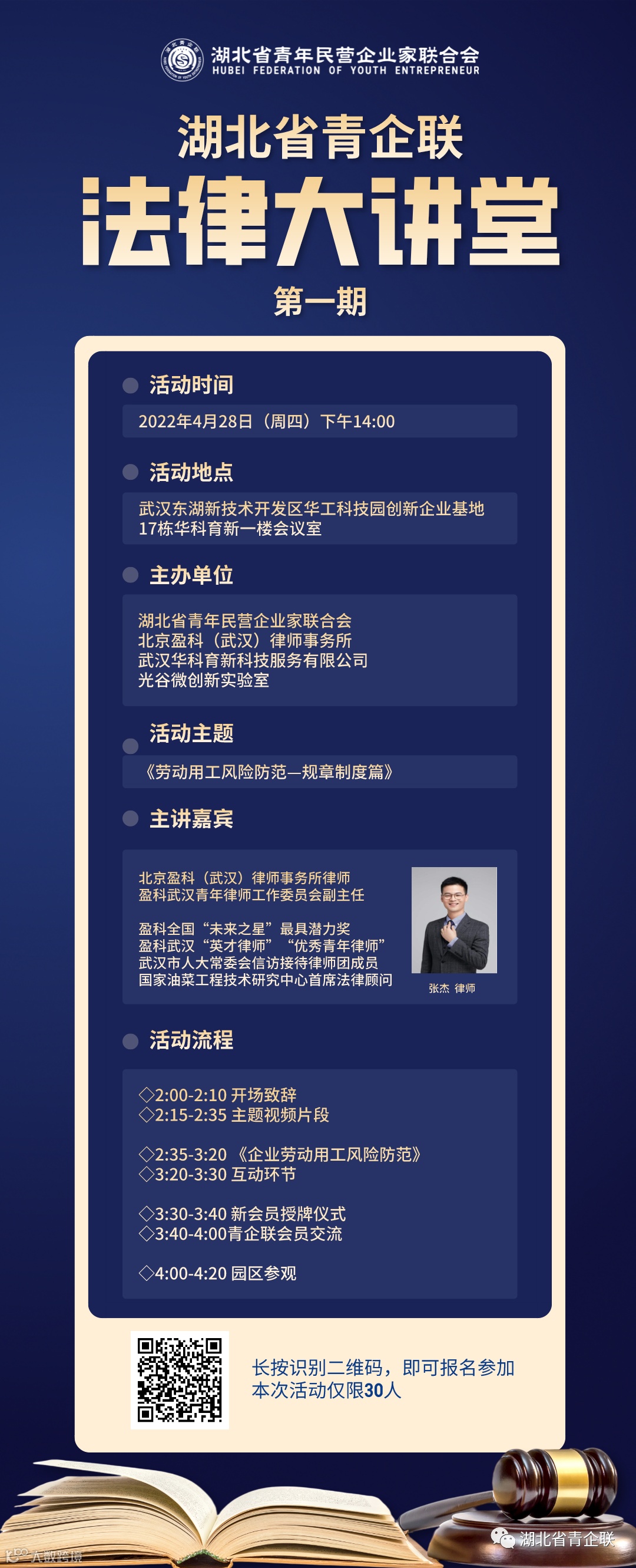 为深入推进企业构建和谐劳动关系,增强企业依法用工意识,避免不必要的违法用工成本支出,提升人事管理水平,建立规范有序、公正合理、互利共赢、和谐稳定的劳动关系新局面,现光谷微创新实验室联合湖北省青企联特邀请资深律师,为会员单位及广大创业者举办用工管理法律讲座:《劳动用工风险防范—规章制度篇》。
