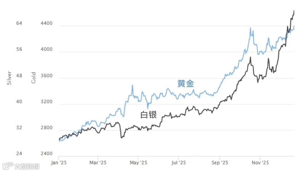黄金白银价格节节高升(图一),尤其是白银(黑色折线),从今年初至本周一(12月22日),累计涨幅突破125%,远超过黄金同时期67%的涨幅,也创下数十年新高。