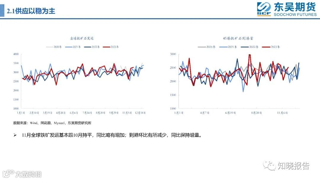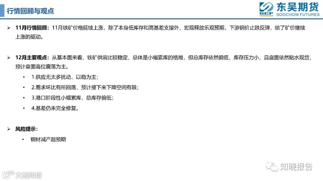 11月行情回顾:11月铁矿价格延续上涨,除了本身低库存和高基差支撑外,宏观释放乐观预期,下游钢价止跌反弹,给了矿价继续上涨的驱动。