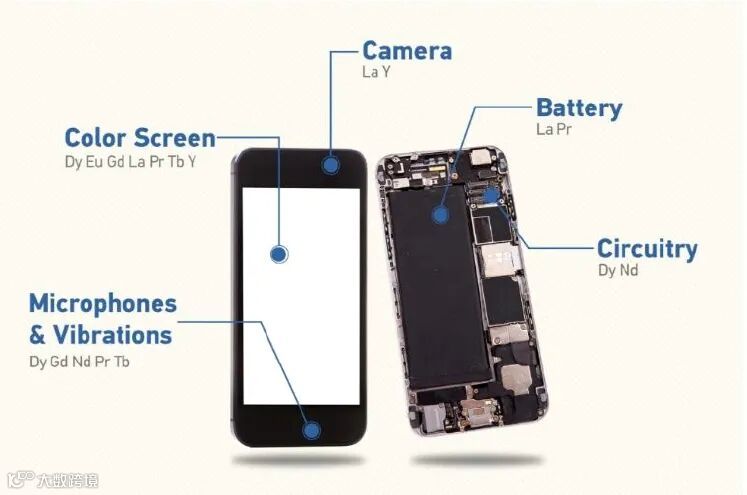 图一、以智能手机为例,稀土被广泛运用在屏幕、相机、麦克风、震动装置、电池等不同的零组件当中。