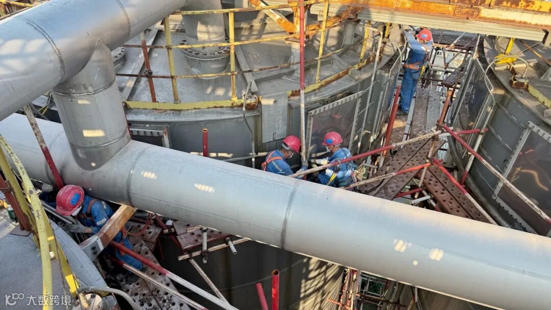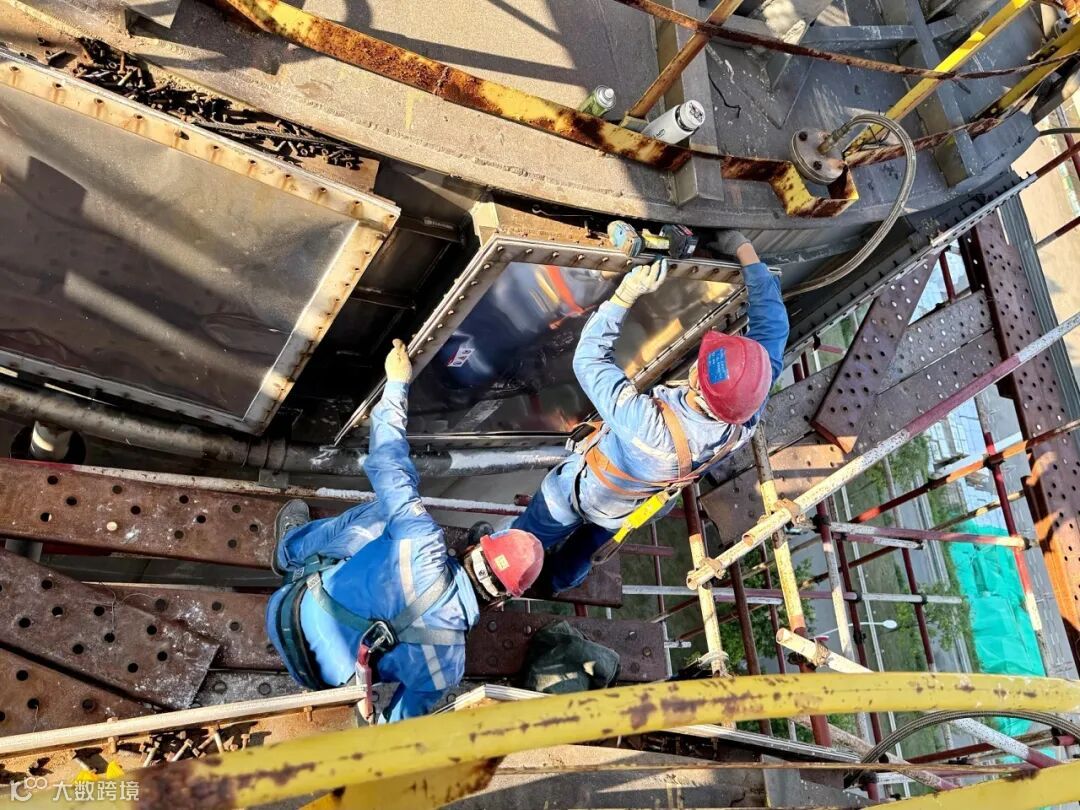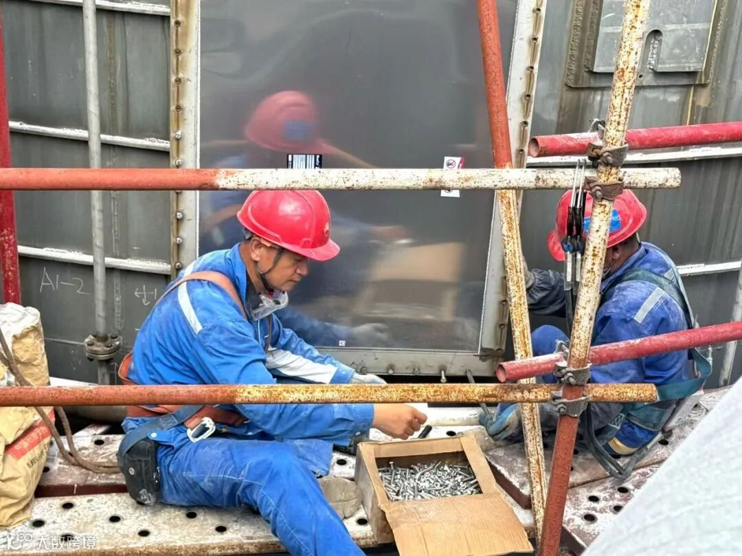 为抢抓关键窗口期,团队采用“两班倒”连续作战模式,以“钉钉子”精神与时间赛跑。尽管现场温度居高不下,汗水浸透工装,但全员斗志不减。他们从清晨到深夜,脚手架上的身影始终忙碌;从螺栓拆卸到新爆破片安装,每一步都严格把控质量关。最终,仅用4天便完成全部96个爆破片更换。