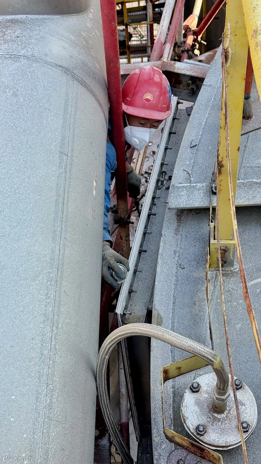 本次更换作业在50米高空的料仓顶部展开,作业空间极为狭小,工作人员只能在狭窄的脚手架跳板上小心翼翼地操作,行动空间受限,操作难度极大。此外,作业时现场有大量聚丙烯颗粒飞舞,增加了滑倒、吸入粉尘等风险,进一步加大了作业的危险性。