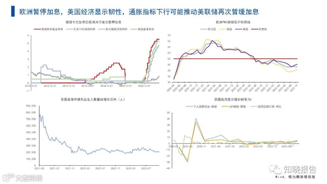 美国新订单数量、消费支出和三季度GDP都显示经济韧性,再次提升年内不会发生衰退的概率;通胀指标的下行与长端收益率上行可能使得美联储11月继续暂停加息;中国推出一万亿国债刺激政策,但考虑到现有财政支出规模和地方债问题,该政策实际作用有待观察。