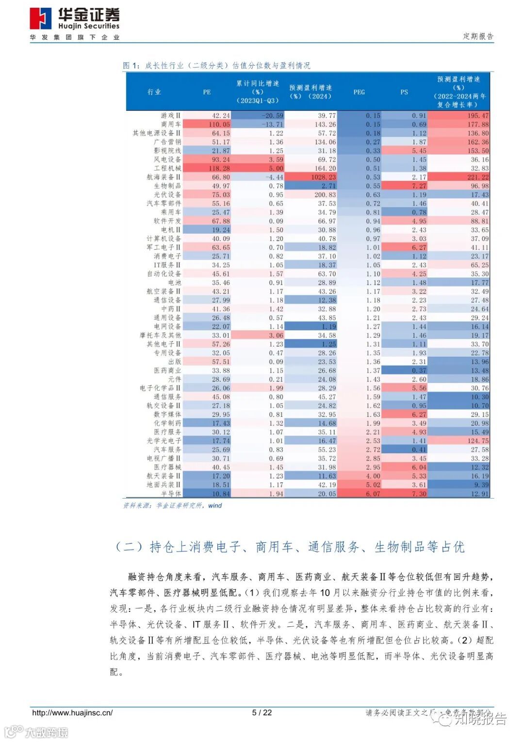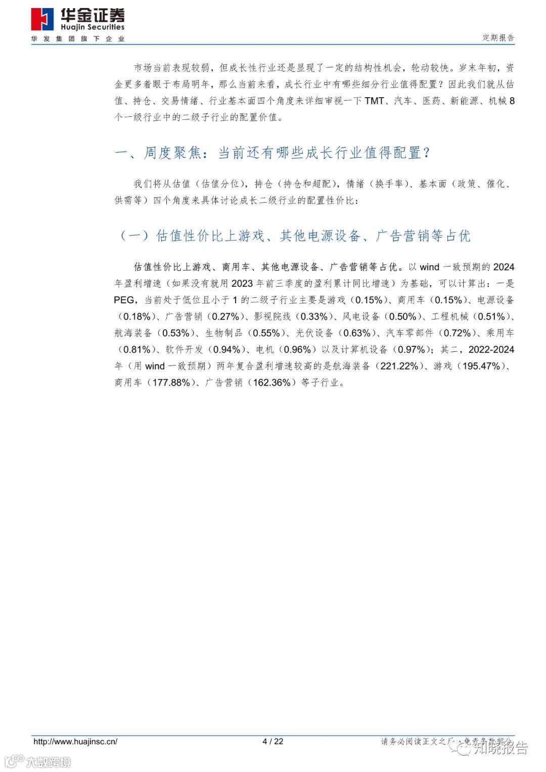 估值性价比上游戏、其他电源设备、广告营销等占优。一是 PEG 上,当前 PEG小于 1 的是游戏、商用车、电源设备、广告营销和影视院线等;二是盈利增速上,2022-2024 两年复合盈利增速较高的是航海装备、游戏、商用车、广告营销等行业。