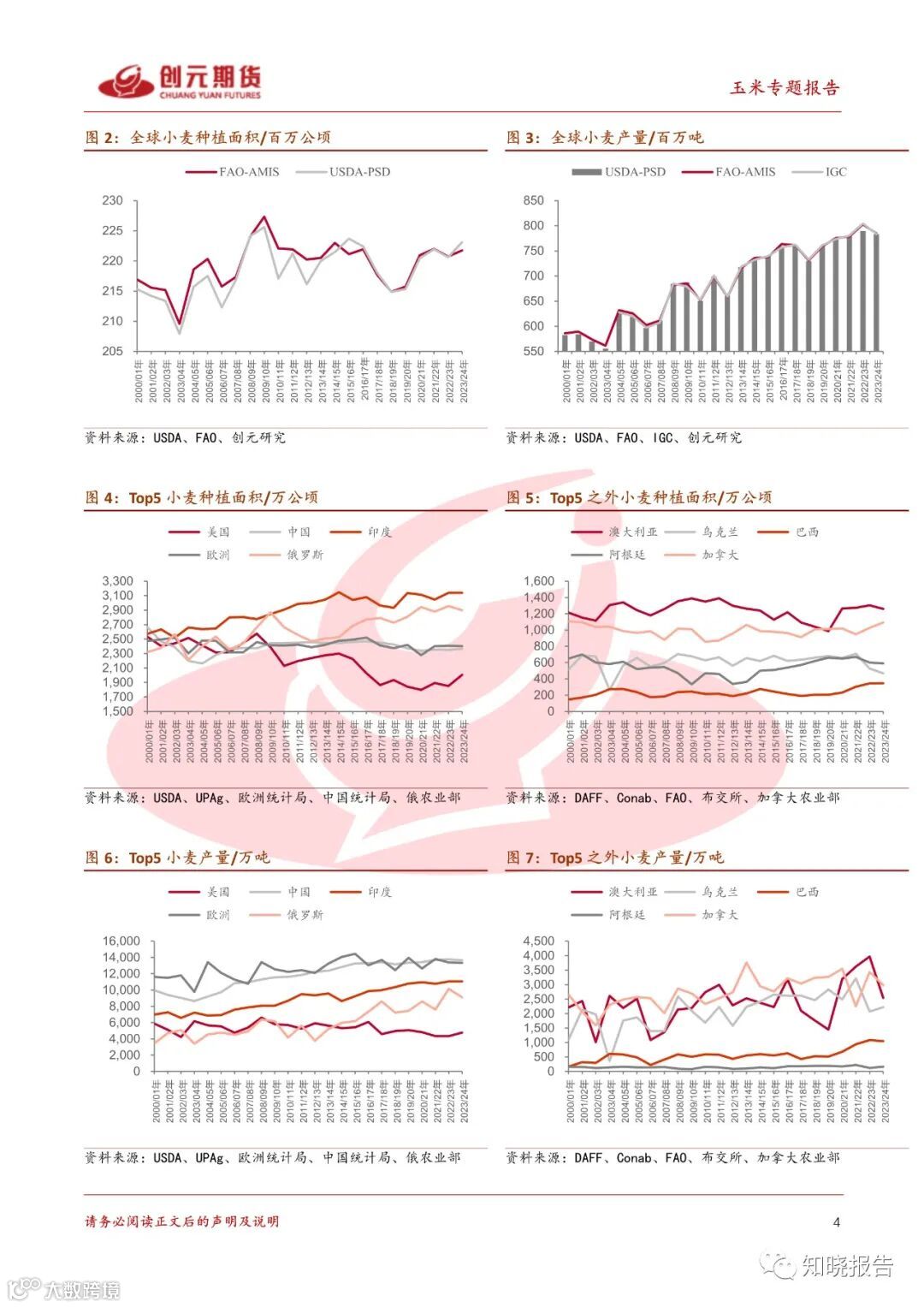 根据 FAO 和 USDA 数据显示,2023/24 年小麦种植面积同比去年分别增 0.5%、1.1%,全球产量在 7.83-7.84 亿吨之间;FAO、IGC、USDA 预估产