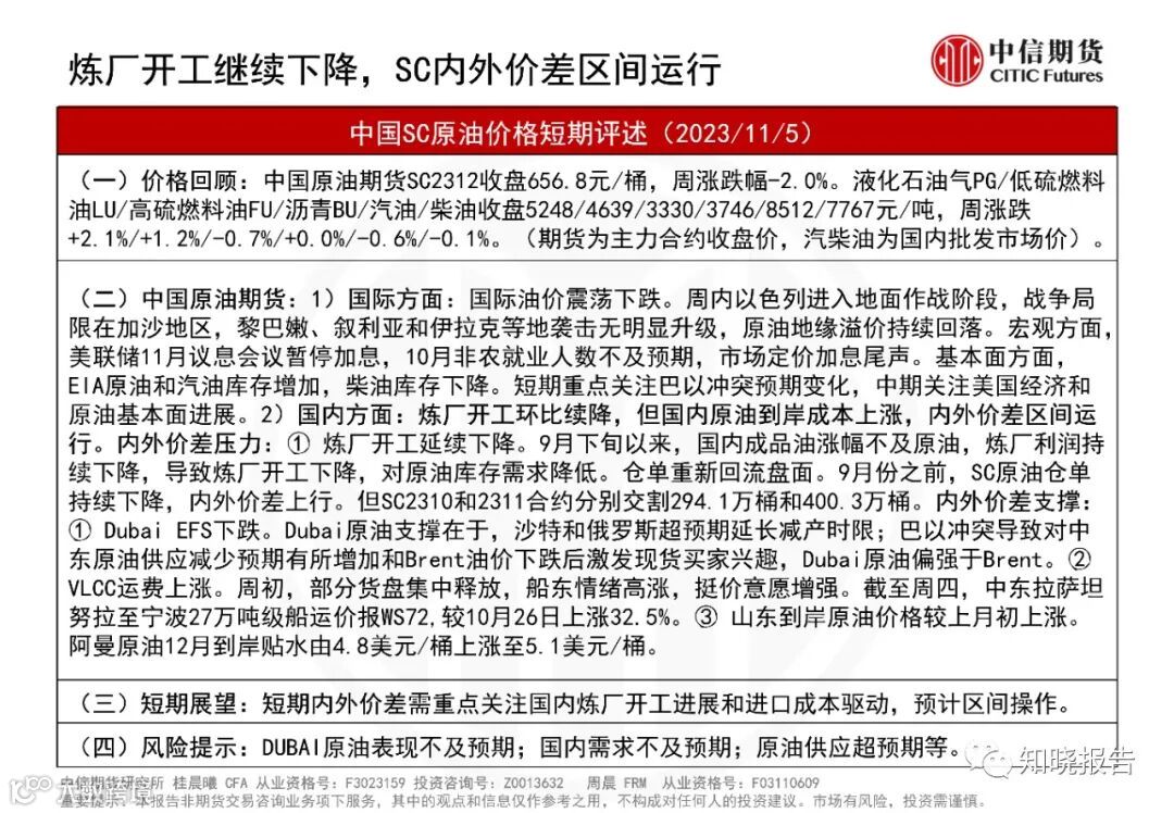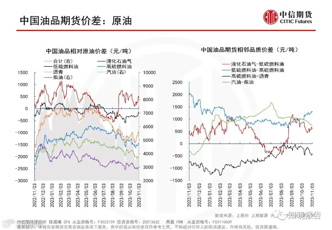 基本面方面,EIA原油和汽油库存增加,柴油库存下降。短期重点关注巴以冲突预期变化,中期关注美国经济和原油基本面进展。国内方面:炼厂开工环比续降,但国内原油到岸成本上涨,内外价差区间运行。内外价差压力:炼厂开工延续下降。