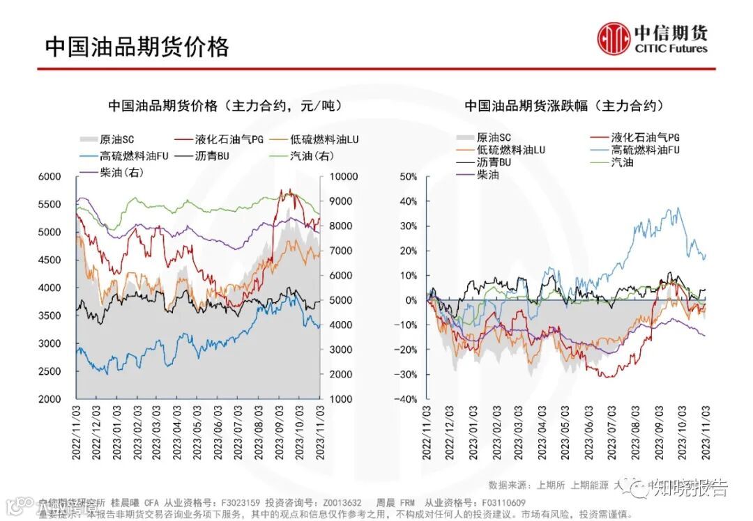 国际方面:油价震荡下跌。周内以色列地面作战阶段,战争局限在加沙地区,黎巴嫩、叙利亚和伊拉克地袭击无明显升级,原油地缘溢价持续回落。