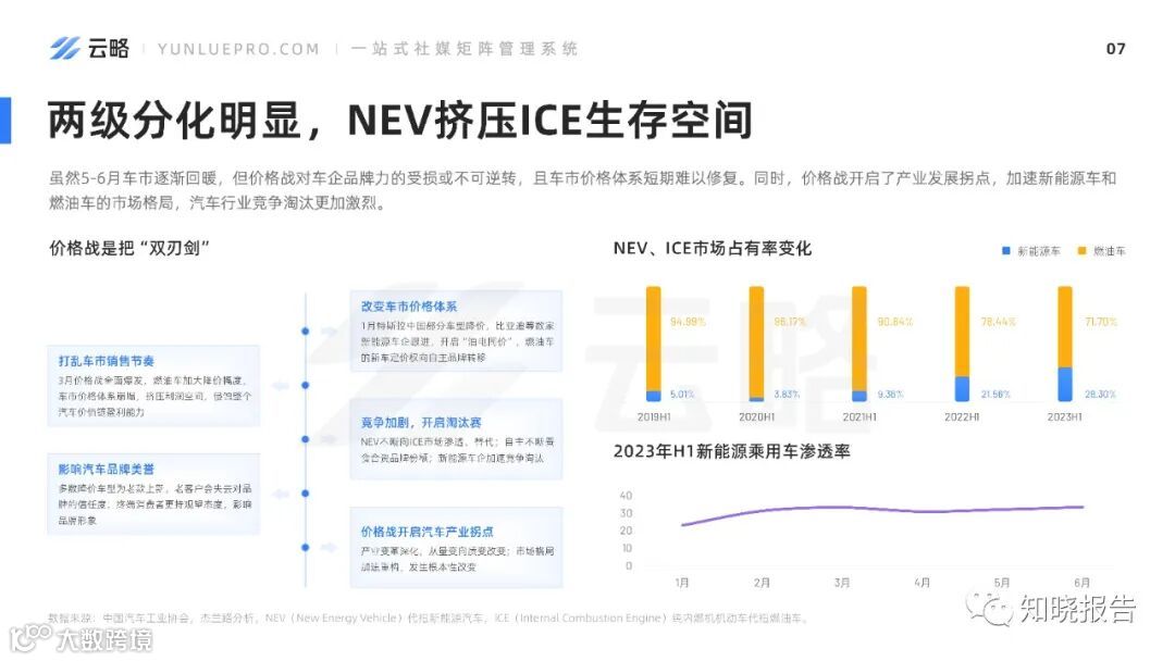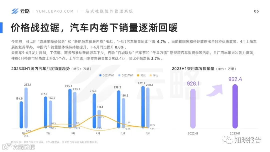 各大车企纷纷布局线上营销,线上数字化体验的发展成为车企的关注点,即借助数字化手段直连用户,更精准和有效地满足用户的需求,2023上半年车市以“价格战”魔幻开场,在国六B政策和新能源车强势崛起的夹击之下,燃油车“降价潮”爆发,被媒体称为“史上最卷的一年”。“内卷”之下,汽车营销玩法越来越多样,品牌的矩阵式营销也成为头部车企的重点营销战略。